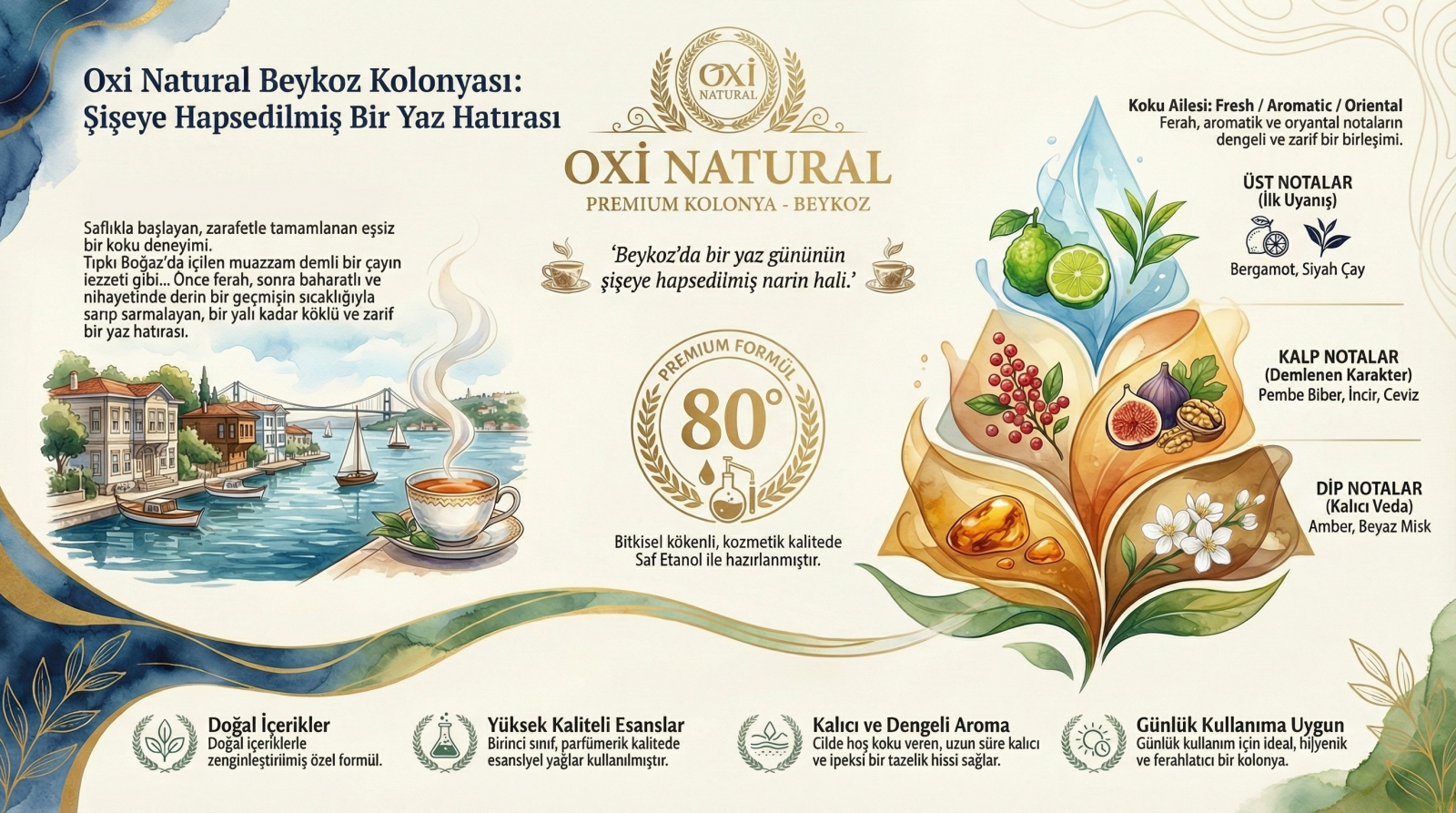 Oxi Natural Beykoz Kolonya önce ferah, sonra baharatlı ve nihayetinde derin bir geçmişin sıcaklığıyla sarıp sarmalayan bir yaz hatırası kadar zarif, bir yalı kadar köklü.