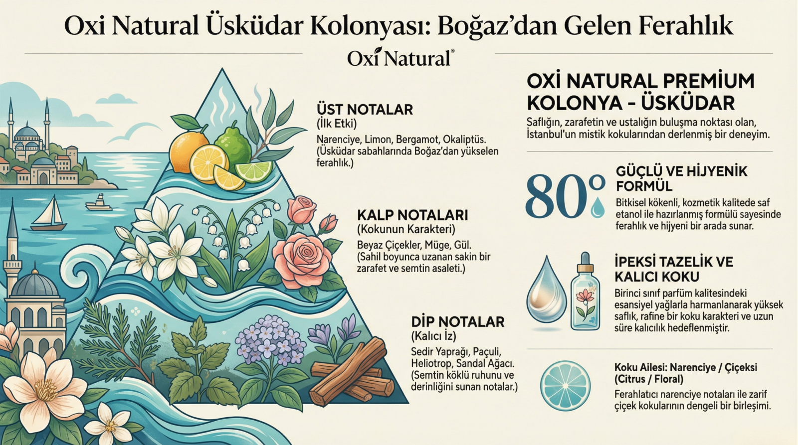 Oxi Natural Premium 80° Kolonyalar; İstanbul’un Mistik, Türkiye’nin Enfes Gurme Kokularından Derlenmiştir.